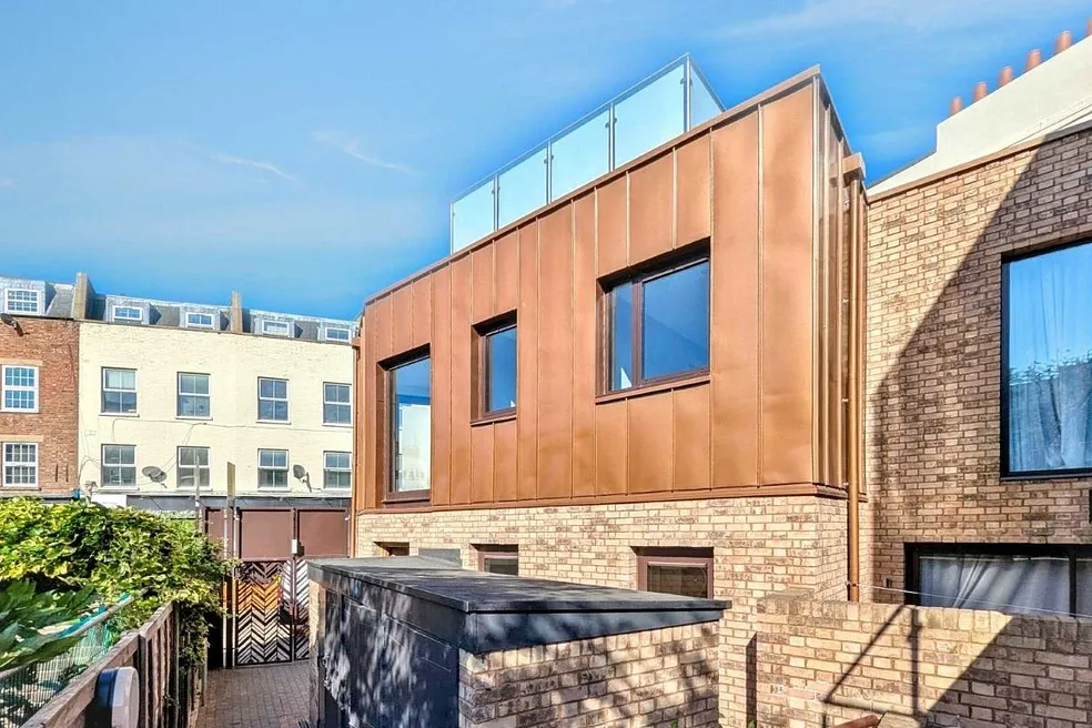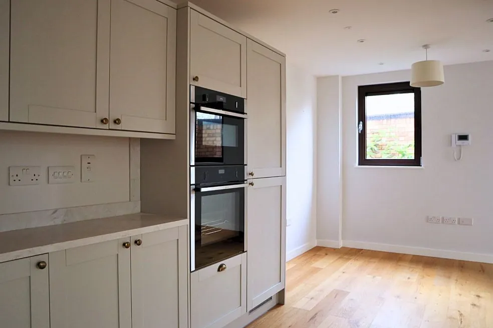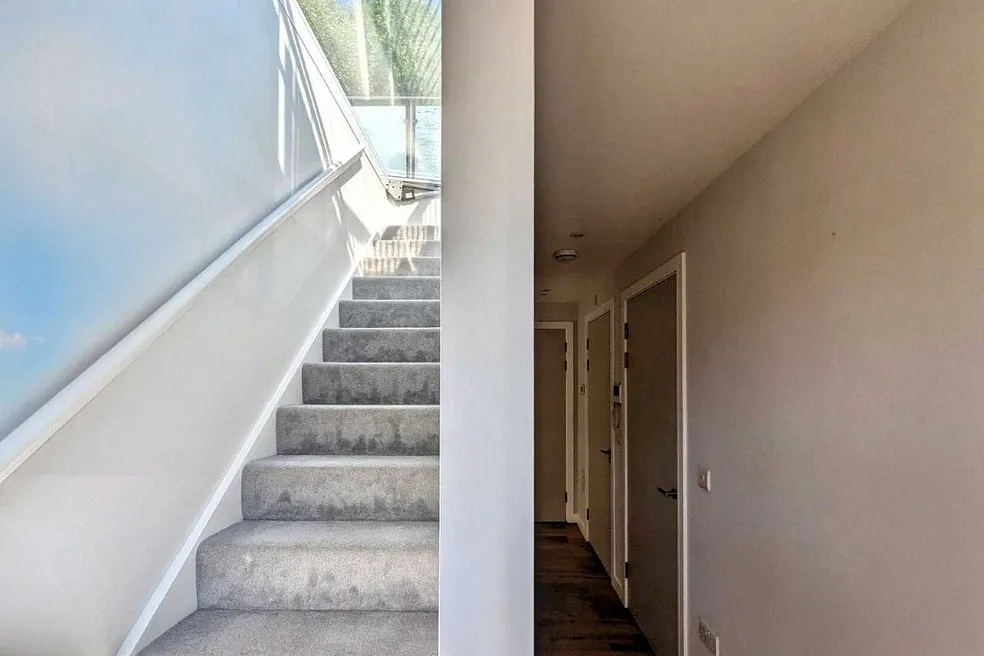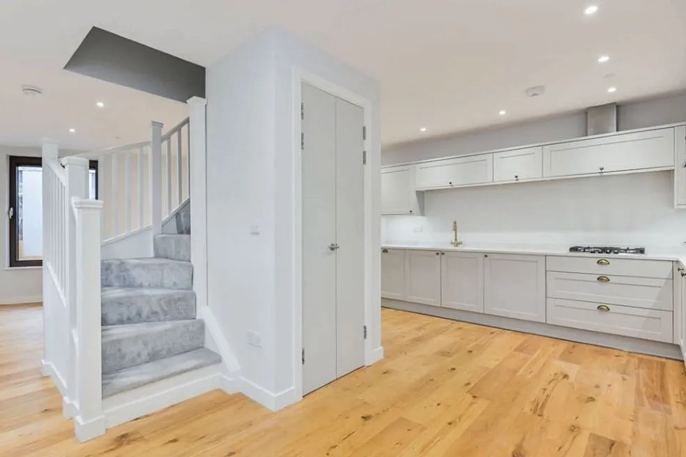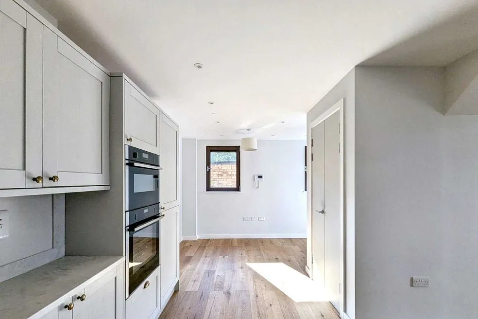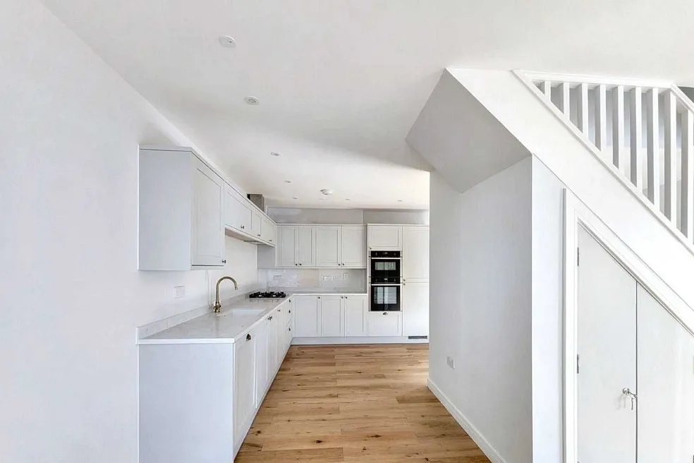 This new-build property offers a double-aspect open-plan lounge/kitchen/diner on the ground floor, thoughtfully arranged around a central staircase and featuring integrated storage for a clean, contemporary layout. On the first floor you’ll find two generously sized bedrooms plus a fully tiled family bathroom. From there a final staircase leads up to a beautiful roof terrace, which is accessed via an electronic roof door and enjoys elevated views of the surrounding neighbourhood. Located in t