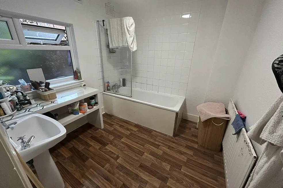 The flat is equipped with a two-piece white bathr